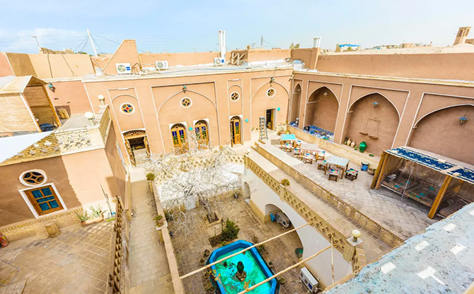 Agha Bozorg Mosque in Kashan is a magnificent mosque that captures the attention of visitors. With its minarets, spacious inner courtyard, and tall dome, it invites contemplation and reflection in every passerby. Just around the corner from the mosque, you enter a beautiful traditional hotel with a courtyard adorned with a small garden and a striking mansion. This mansion holds many stories of past visitors and residents, leaving behind their memories. The courtyard is embellished with a water fountain, beautiful flowers, traditional arched windows, and exquisite light fixtures that create a vibrant play of colors during twilight as the colored windows welcome the hues of the evening. At night, when the star-filled sky spreads its canopy overhead, you will experience the most beautiful sensations of traditional Iranian life. This historic house is located in the traditional fabric of Kashan, within walking distance to historical houses like Tabatabaei House, Borujerdi House, Abbasian House, Ameri House, Sultan Amir Ahmad Bathhouse, as well as the Bazaar and Amin al-Dowleh Timcheh.