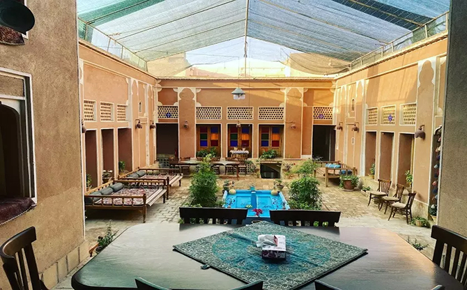 The Ali Baba Hotel in Yazd is a traditional hotel with a century-old history dating back to the Qajar era, which was renovated in 2006. The Ali Baba Hotel, originally named the Oasis Hotel, is one of the 3 hotels in the Yazd Silk Road chain. The traditional Ali Baba (Oasis) Hotel in Yazd is actually a mud brick house with a cozy small courtyard that has preserved its historical structure well. With two lush gardens surrounding a water-filled pond, the serenity of the house is complemented. The traditionally furnished beds with carpets and backrests, along with wooden tables and chairs around the courtyard, create a pleasant environment for relaxation and enjoyment of this traditional house. During the winter season, the courtyard ceiling of the Ali Baba Hotel in Yazd is covered with thick fabric to provide a warm and intimate atmosphere for its valued guests in the cold desert climate of the ancient city of Yazd. Two tall windcatchers on top of a large adobe hall, along with narrow columns, create a grand collection of the Ali Baba Yazd restaurant where celebrations and memorable nights can be held. The Ali Baba Yazd Hotel has 8 rooms with 30 beds featuring small colorful alcoves and 2 suites with adobe walls adorned with floral motifs, old vases, and a traditionally dressed female mannequin, equipped with gas cooler, internet, and Western-style toilet facilities. Tourist attractions and historical sites near the Ali Baba Hotel in Yazd include Haji Ghorban Mosque, Khan Complex, Jameh Mosque of Yazd, Seyyed Roknaddin, Vaght-e Saat Square, Mervad Library, and handicraft shops.