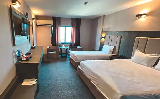 The four-star Aramis Hotel was opened in the northeast of the beautiful Kish Island near Pardis Bazaar in the year 2008. This hotel, with 4 floors, has 60 different-sized accommodation units with beautiful and pleasant views, along with providing desirable facilities and services. Among the amenities of this hotel, there are two restaurants offering Iranian and French cuisine, including a traditional restaurant with unique Safavid architecture and a spaghetti house restaurant serving various Italian dishes, island tours, classic decor, elegant spaces, green areas, and experienced staff.