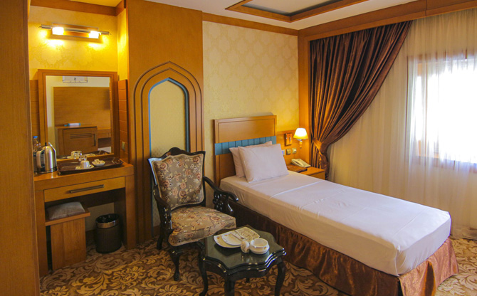 **Free airport transfer except for peak days** During official holidays, transfers are not available due to road closures. **Hotel Madinat Al-Reza** is known as the nearest luxurious five-star hotel to the holy shrine, located just 2 minutes away from the holy shrine. The architecture of this hotel is in the style of authentic Iranian Islamic architecture. What sets this hotel apart from other hotels in Mashhad is the presence of the revolving Panorama restaurant entirely made of glass at the highest point of the hotel, offering a view of the holy shrine. Another advantage of this hotel is its buffet breakfast and dinner offered every day of the year. Additionally, there is a traditional restaurant with a nostalgic atmosphere offering an à la carte menu and salad buffet. The presence of a permanent art gallery adds to the allure of this hotel. Some of the excellent amenities of the hotel include separate swimming pools for men and women, high-speed free internet, a childrens playroom, and a library. The wide variety of rooms in this hotel makes it easy to choose, with economy, standard, luxury, and VIP rooms available.