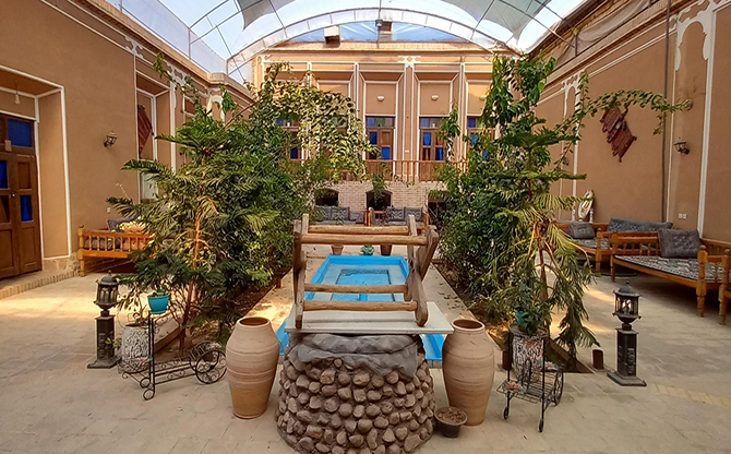 Noghreh Eco Lodge is located in the historical neighborhood of Fahadan in Yazd, the first adobe city in the world. This ancient traditional house belongs to the Qajar period and has a history of over 100 years. The lodge was renovated in 2017 and opened as Noghreh Eco Lodge for visitors to enjoy. Upon entering through the wooden gate of the lodge and passing the traditional Dalan, you will see the courtyard and beautiful surroundings of this traditional house, with traditional beds, wooden tables and chairs set around a turquoise water basin for tourists to rest and enjoy tea and herbal drinks. Facilities and services provided: Noghreh Yazd traditional lodge has 8 rooms decorated with antique objects in a completely traditional style, all equipped with necessary amenities for tourists. Tourist attractions in the area: The bazaar and Hammam Khan (the longest bazaar in Yazd), Koushk Nou watermill, historical Lariha house, coppersmiths bazaar, and Dolat Abad Garden hosting the tallest wind tower in the world and Alexander Prison are among the historic and tourist sites near Noghreh Eco Lodge. Another recommended place to visit is the Sabats of Yazd, which are covered alleyways built to protect people from the intense sunlight and heat of the desert city. These Sabats also prevent cold air from entering the alleys during winter and help keep them warm. The beautiful architecture of the Sabats has turned these old alleys into a tourist attraction. Approximate distances from the lodge to tourist attractions and key locations: Distance to Shahid Sadooghi International Airport Yazd > 11.8 km (20 minutes) Distance to Yazd Railway Station > 7.1 km (14 minutes) Distance to Yazd Bus Terminal > 12.6 km (22 minutes) Distance to Yazd Traditional Textile House > 19 meters (1 minute) Distance to Lariha Historical House > 170 meters (1 minute) Distance to Alexander Prison > 400 meters (1 minute) Distance to Koushk Nou Watermill > 140 meters (1 minute) Distance to Yazd Traditional Handicrafts Shop > 400 meters (3 minutes) ... (the rest of the distances to other attractions are listed)