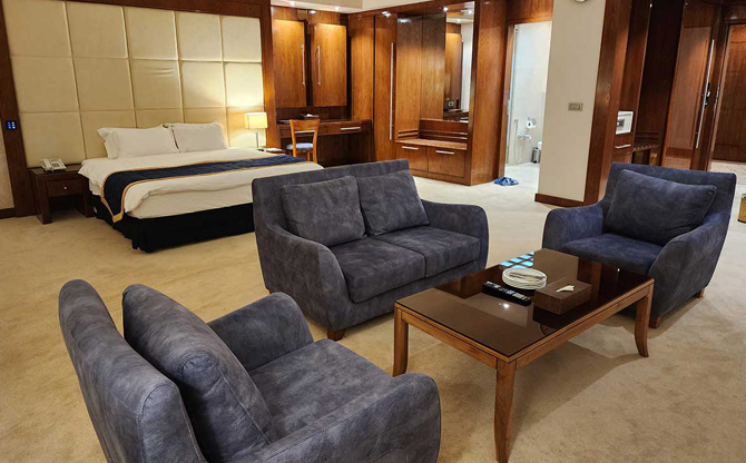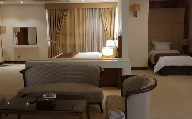 The world-class five-star hotel has a total area of approximately 34,000 square meters, with 14 floors and 162 rooms, suites, and condos to accommodate its esteemed guests. This hotel is located adjacent to the holy shrine of Imam Reza (AS) and within a 200-step distance from the Ghadir Courtyard. By just a 3-minute walk, guests can easily access the holy shrine. The hotel is accessible from Shirazi Street in the north and Ayatollah Behjat Street in the west, and it is located near the pedestrian pathway of Ayatollah Waez Tabasi.